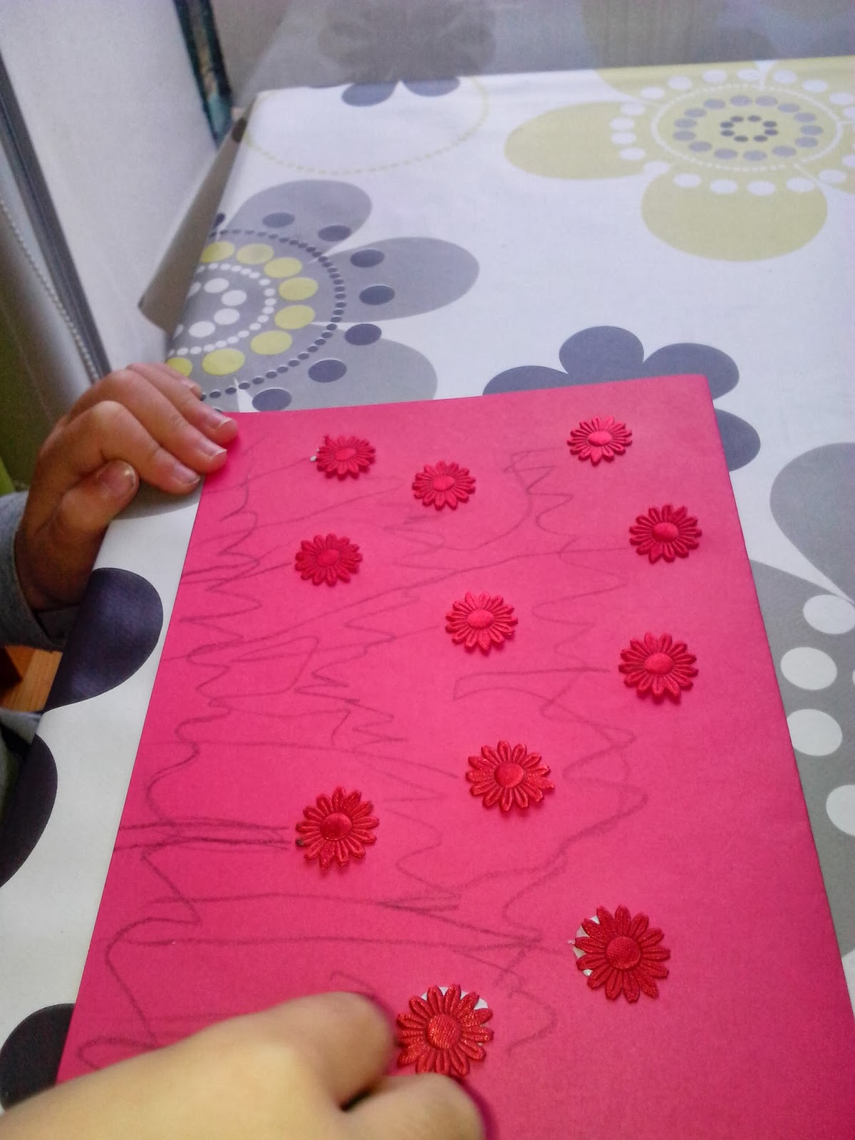 Rano, przed przedszkolem, zobaczył, że wyschło, zapytał co dalej, dałam mu wykałaczkę i rysował. Ja narysowałam drzewo, księżyc i gwiazdy. Gabryś narysował pająka zwisającego na pajęczynie z drzewa - przez przypadek drapnął pazurkami :-), a Wiktor zobaczył tego pająka właśnie.